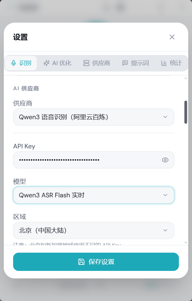 - 回到 SpeakIn 设置页 -> 识别,把 ASR 服务商切成 百炼 Paraformer 或 千问 Qwen3 ASR