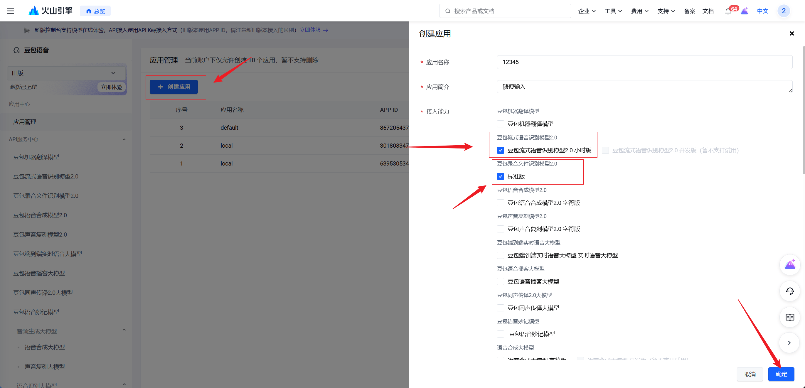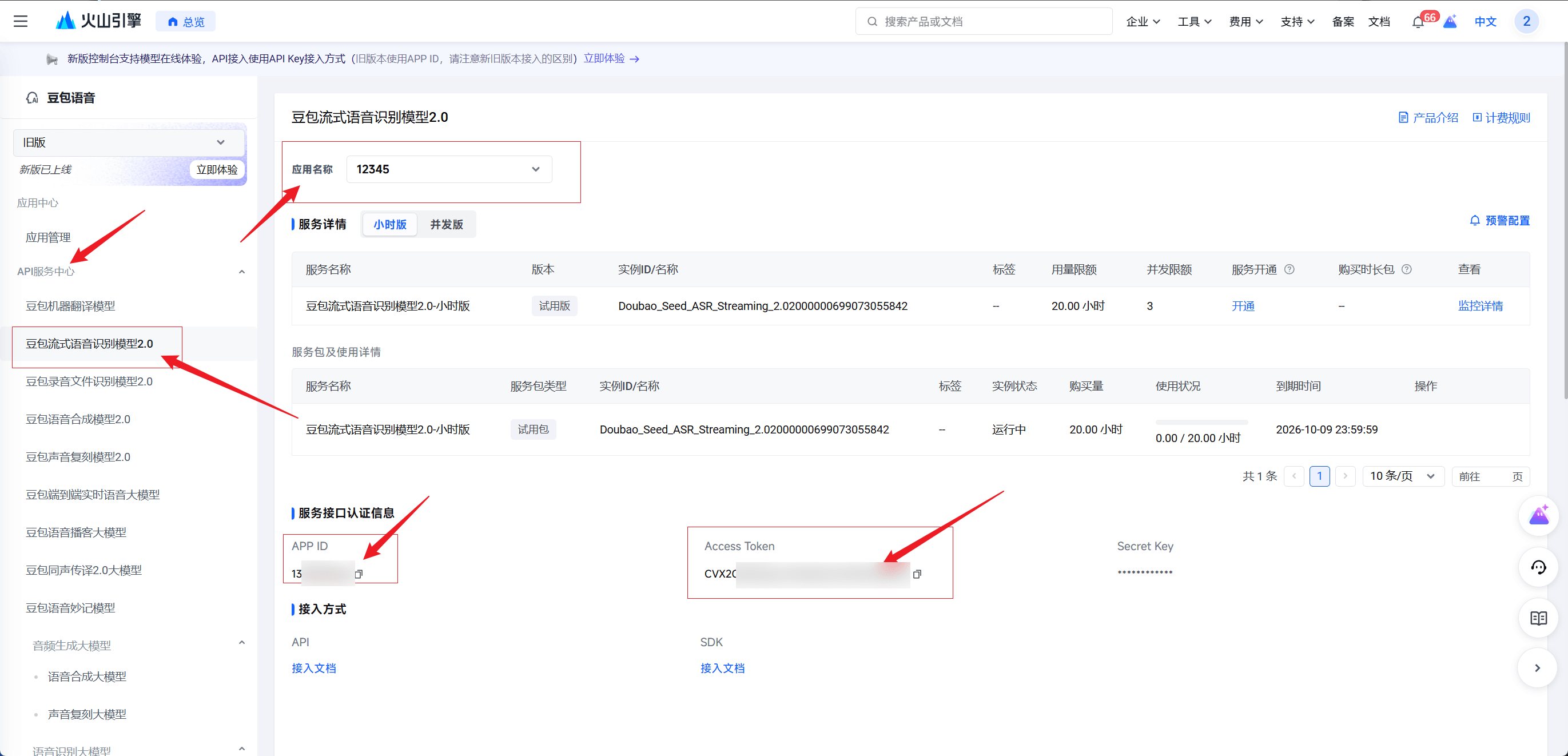 - 应用创建成功后,进入应用详情页,或者在左侧导航栏点击刚开通的豆包流式语音模型