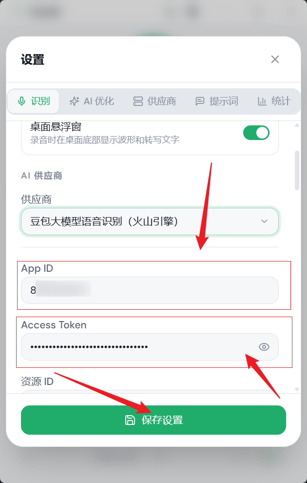 - 回到 SpeakIn 软件的设置页 -> 识别 -> 豆包配置区,把这两个值粘贴进去